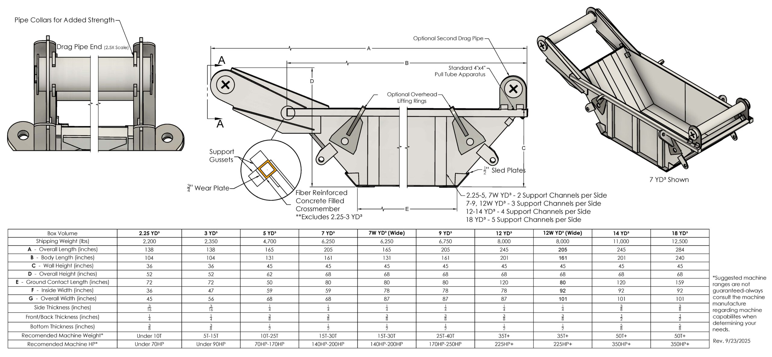 This 6,250 pound box and has an overall 68 in. Height, 68 in. Width, and 7 Cubic Yard Capacity. Recommended Machine Weight (15-30T and 140-200HP).